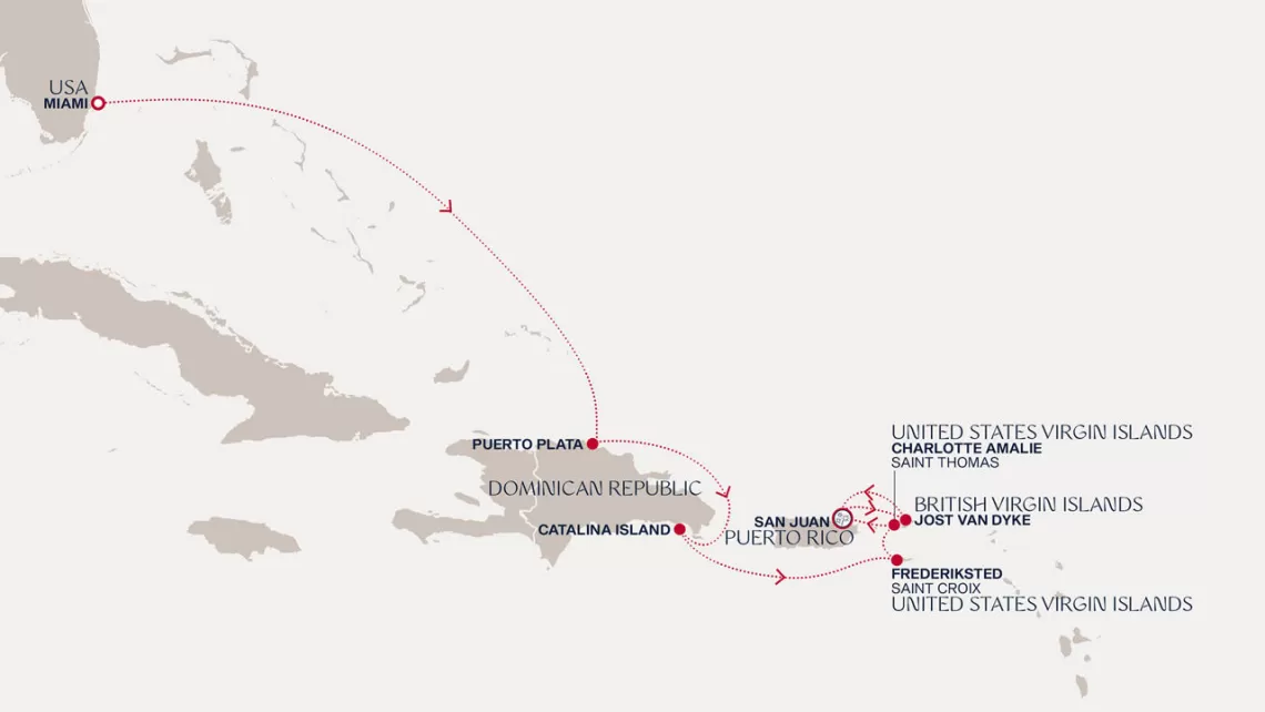 Маршрут круиза: Майами - море - Нью-Йорк - о. Йост-Ван-Дайк - Деше, о. Гваделупа - Бриджтаун, о. Барбадос - Фор-де-Франс, о. Мартиника - Бастер, о. Сент-Китс - Сан-Хуан - Густавия, о. Сен-Бартельми - Сент-Джонс, о.Антигуа - Род-Таун, о. Тортола - Роуд Бэй, о. Ангилья - море - море - Майами