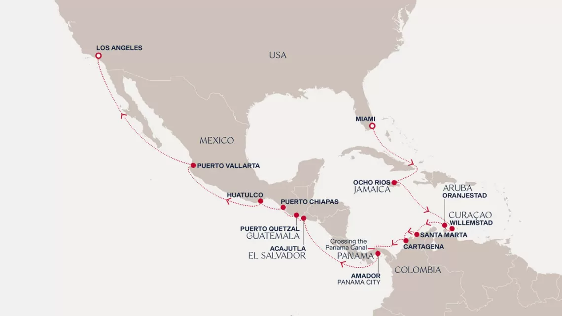 Маршрут круиза: Майами - море - Очо-Риос - море - Виллемстад - Ораньестад, о. Аруба - Санта-Марта - Картахена - Картахена - Панамский канал - Пуэрто Амадор - Пуэрто Амадор - море - море - Акахутла - Пуэрто-Кетсаль - Пуэрто Мадеро - Уатулько - море - Пуэрто Вальярта - море - море - Лос-Анджелес