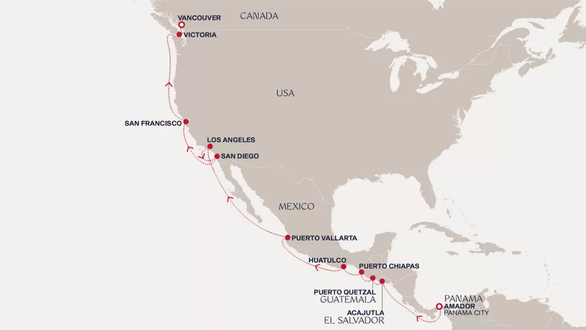Маршрут круиза: Пуэрто Амадор - море - море - Акахутла - Пуэрто-Кетсаль - Пуэрто Мадеро - Уатулько - море - Пуэрто Вальярта - море - море - Лос-Анджелес - Сан-Диего - море - Сан-Франциско - Сан-Франциско - море - Виктория - Ванкувер