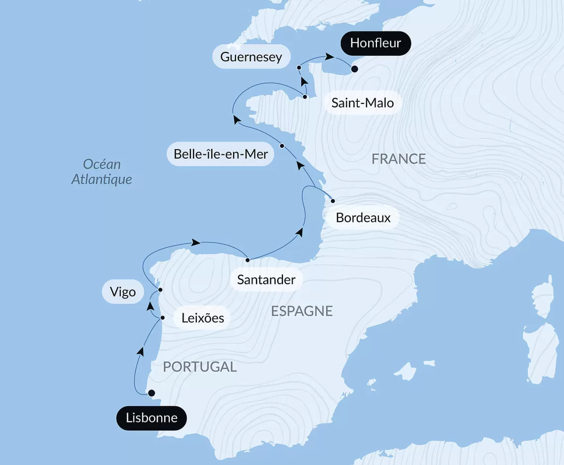 Маршрут круиза: Марсель - Барселона - море - Малага - Гибралтар - море - Лиссабон - море - Лейшойнш - море - Фуншал, о. Мадейра - Лас-Пальмас, о. Гран-Канария - Санта-Крус-де-ла-Пальма, о. Ла-Пальма - Санта-Крус-де-Тенерифе, о. Тенерифе