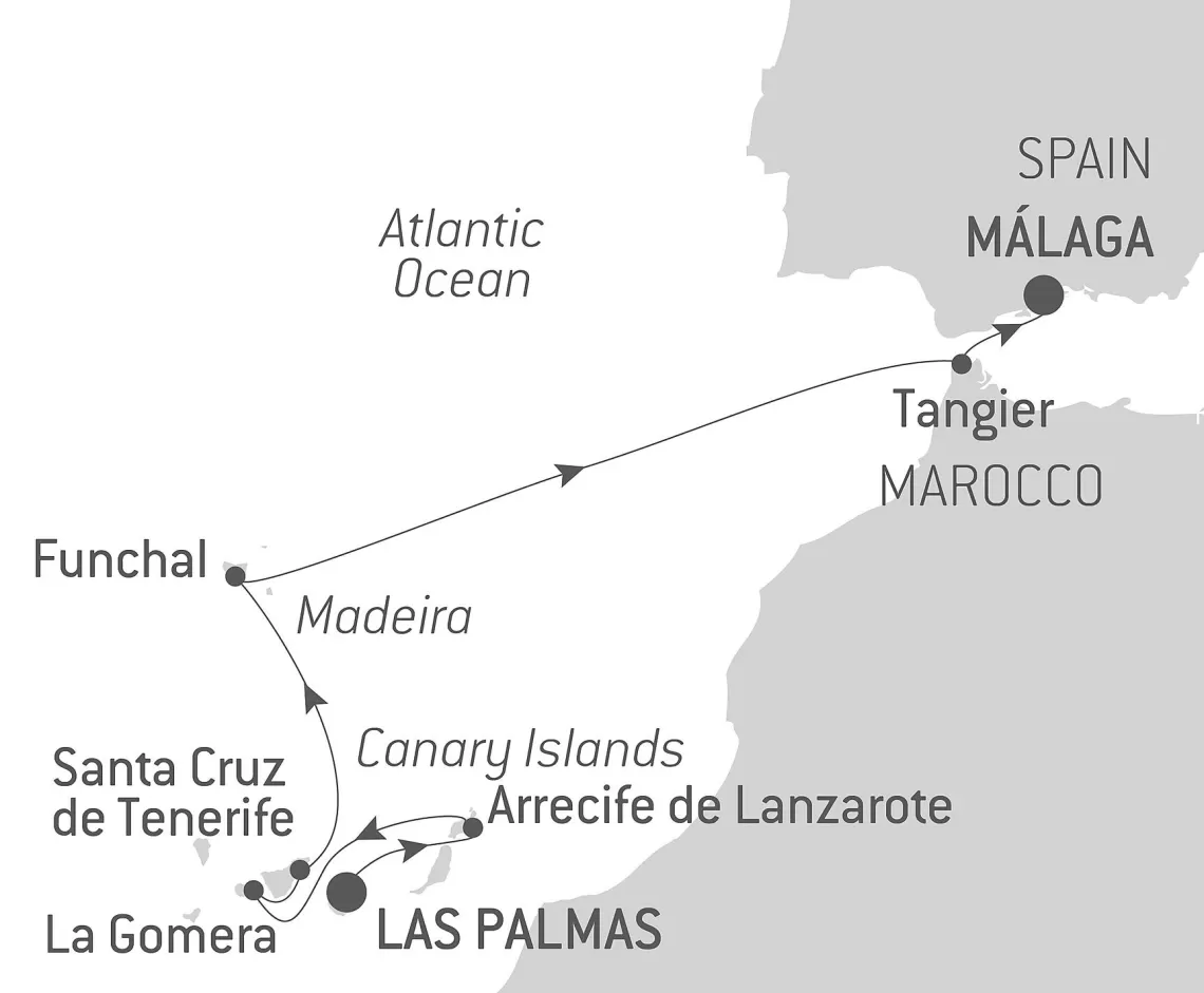 Маршрут круиза: Лас-Пальмас, о. Гран-Канария - Аресифи, о. Лансароте - Сан-Себастьян-де-ла-Гомера - Санта-Крус-де-Тенерифе, о. Тенерифе - Фуншал, о. Мадейра - Фуншал, о. Мадейра - море - Танжер - Малага