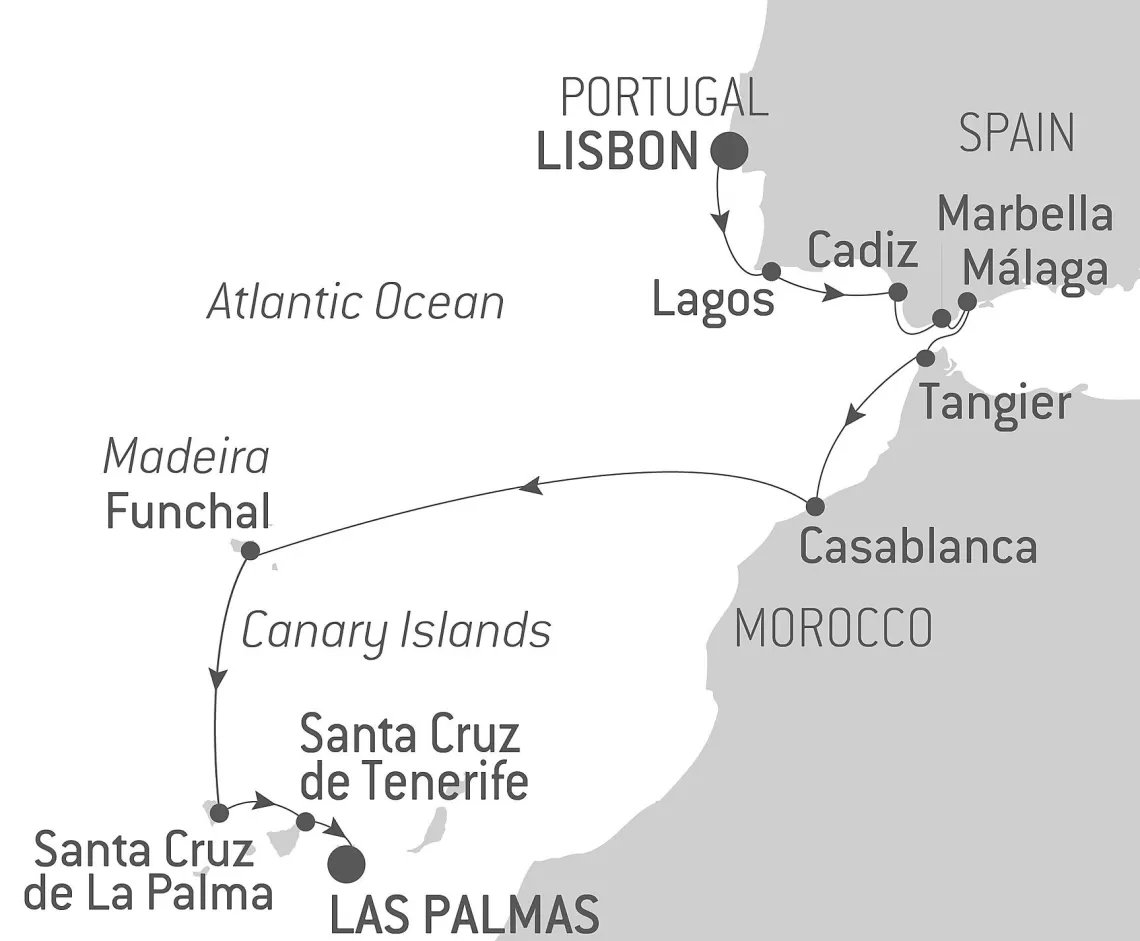 Маршрут круиза: Лиссабон - Лиссабон - Лагуш - Кадиc / Севилья - Марбелья - Малага - Танжер - Касабланка - море - Фуншал, о. Мадейра - Фуншал, о. Мадейра - Санта-Крус-де-ла-Пальма, о. Ла-Пальма - Санта-Крус-де-Тенерифе, о. Тенерифе - Лас-Пальмас, о. Гран-Канария