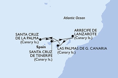 Маршрут круиза: Санта-Крус-де-Тенерифе, о. Тенерифе - Фуншал, о. Мадейра - Фуншал, о. Мадейра - море - Аресифи, о. Лансароте - Лас-Пальмас, о. Гран-Канария - Пуэрто-дель-Росарио, о. Фуэртевентура - Санта-Крус-де-Тенерифе, о. Тенерифе