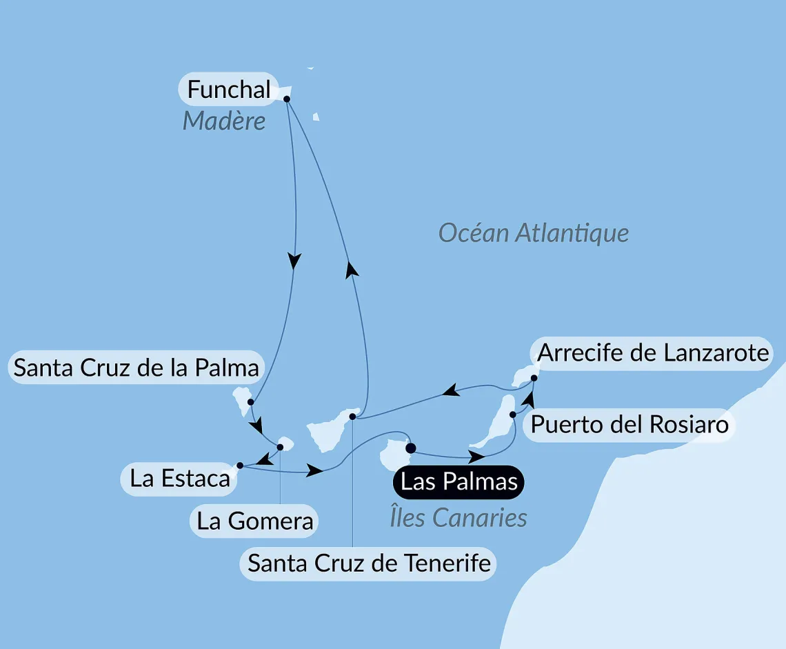 Маршрут круиза: Лас-Пальмас, о. Гран-Канария - Пуэрто-дель-Росарио, о. Фуэртевентура - Аресифи, о. Лансароте - Санта-Крус-де-Тенерифе, о. Тенерифе - море - Фуншал, о. Мадейра - Фуншал, о. Мадейра - Санта-Крус-де-ла-Пальма, о. Ла-Пальма - Сан-Себастьян-де-ла-Гомера - Пуэрто де ла Эстака, о. Иерро - Лас-Пальмас, о. Гран-Канария
