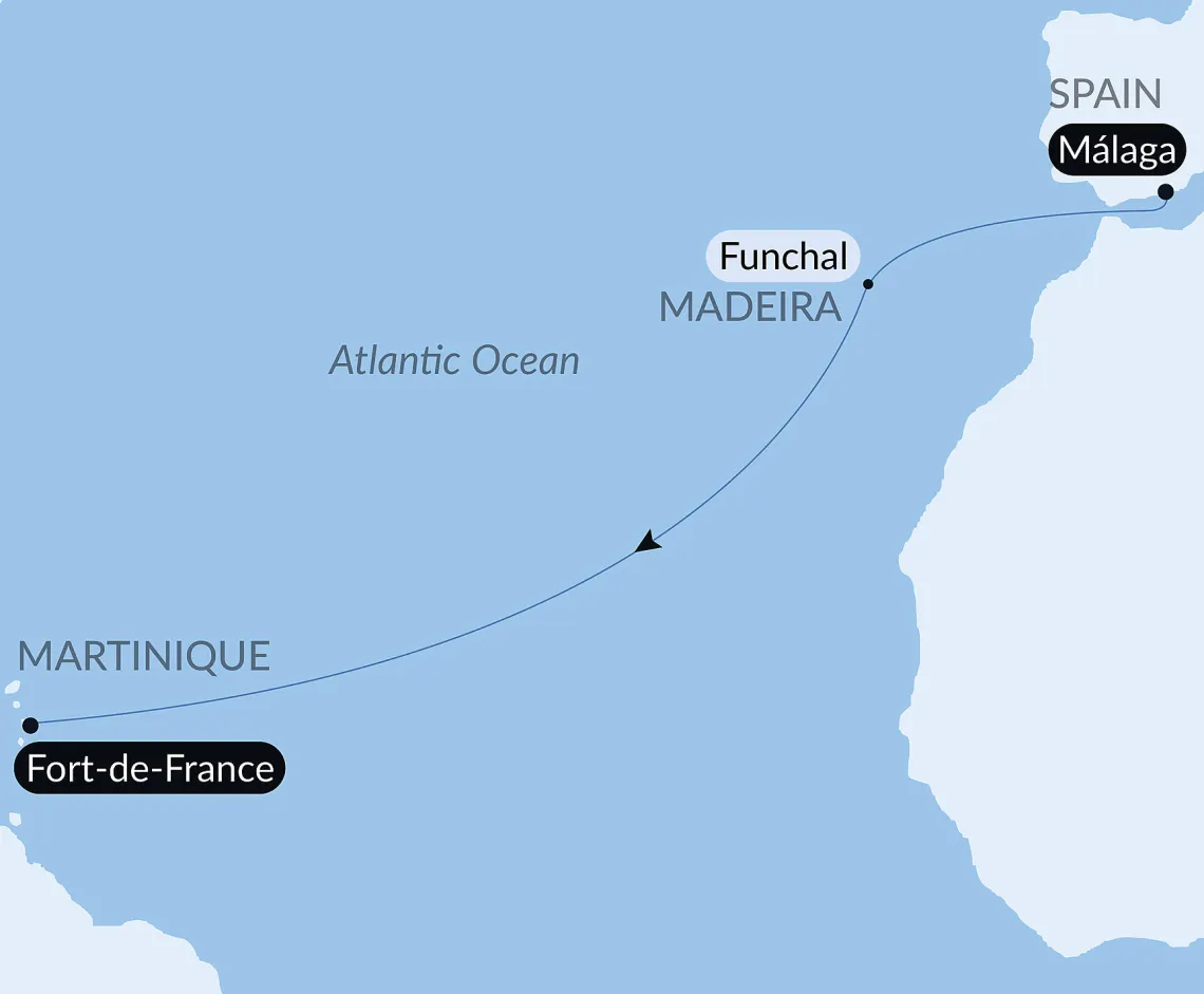 Маршрут круиза: Лас-Пальмас, о. Гран-Канария - Санта-Крус-де-Тенерифе, о. Тенерифе - Сан-Себастьян-де-ла-Гомера - Санта-Крус-де-ла-Пальма, о. Ла-Пальма - Фуншал, о. Мадейра - Фуншал, о. Мадейра - море - Кадиc / Севилья - Уэльва - море - Лиссабон