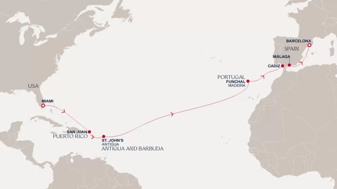 Маршрут круиза: Барселона - Аликанте - море - Лиссабон - Лиссабон - Касабланка - Касабланка - Танжер - Малага - Мотриль - море - Барселона - море - Кадиc / Севилья - море - Фуншал, о. Мадейра - море - море - море - море - море - море - Сент-Джонс, о.Антигуа - Роуд Бэй, о. Ангилья - Сан-Хуан - море - море - Майами