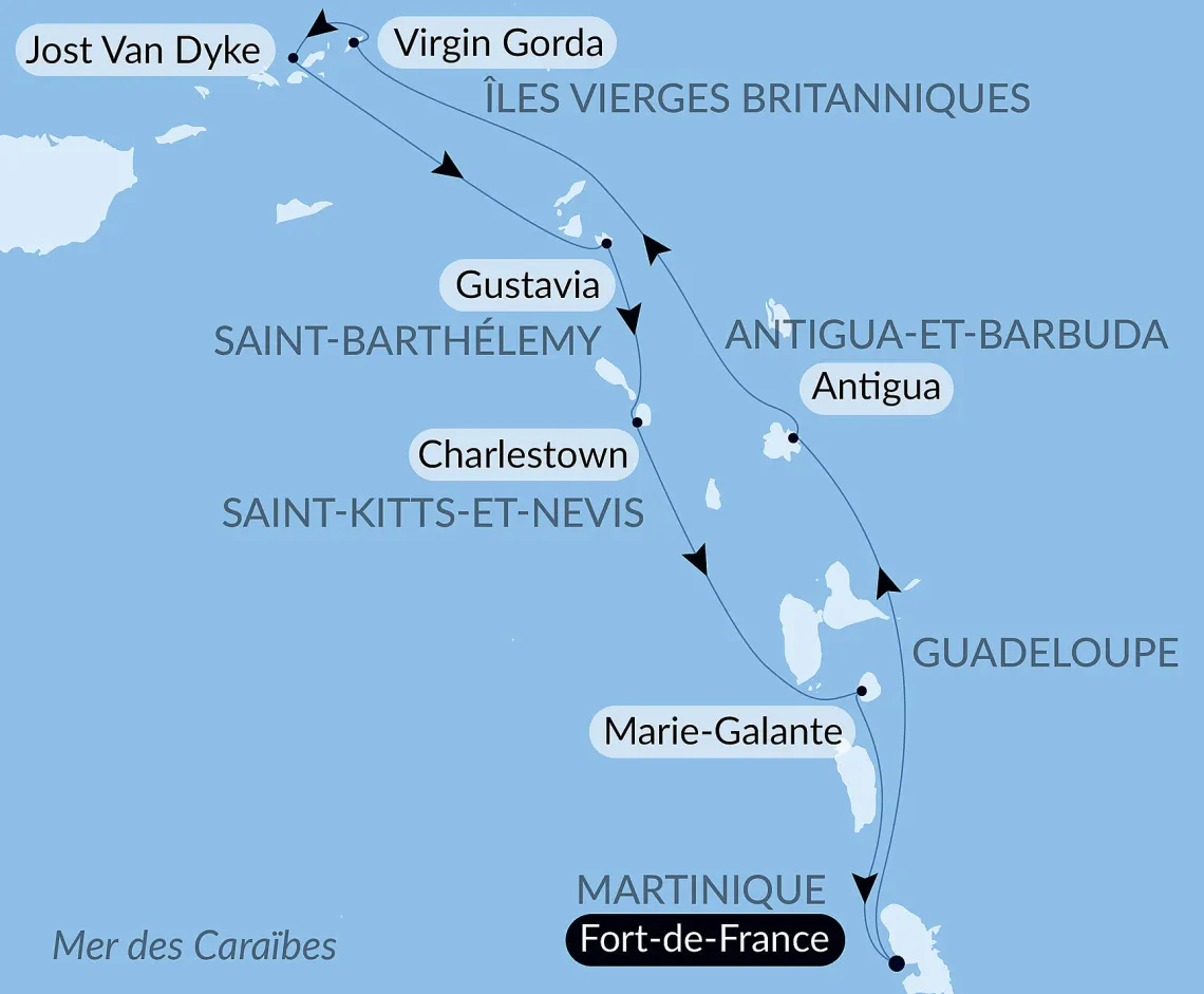 Маршрут круиза: Фор-де-Франс, о. Мартиника - Сент-Джонс, о.Антигуа - о. Верджин-Горда - о. Йост-Ван-Дайк - Бастер, о. Сент-Китс - Деше, о. Гваделупа - о. Мари-Галант, Гваделупа - Фор-де-Франс, о. Мартиника