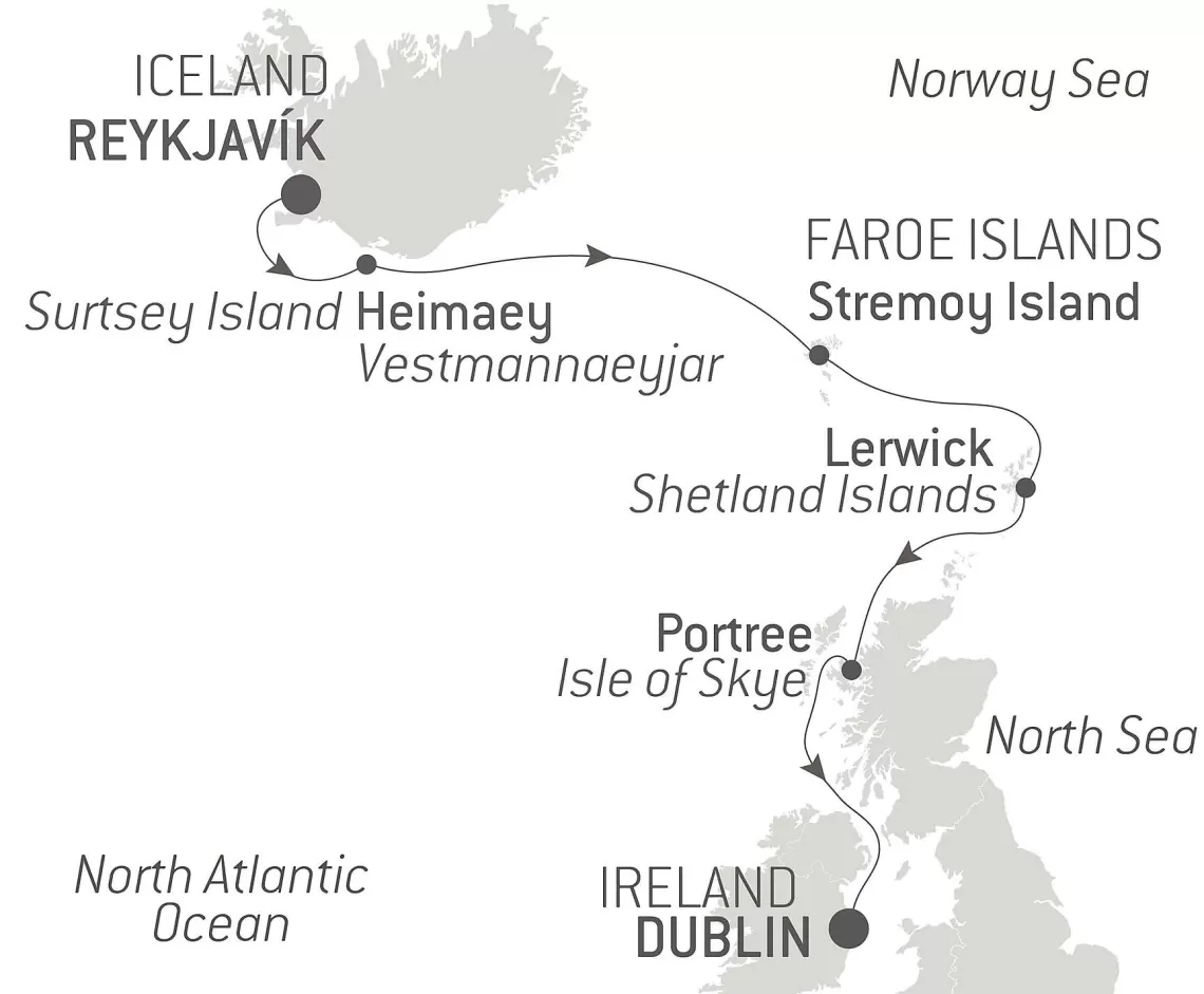 Маршрут круиза: Рейкьявик - Вестманнаэйяр архипелаг - Вестманнаэйяр архипелаг - море - море - Торсхавн, о. Стреймой - Леруик, о. Мейнленд - Керкуолл, Оркнейские острова - море - Дублин