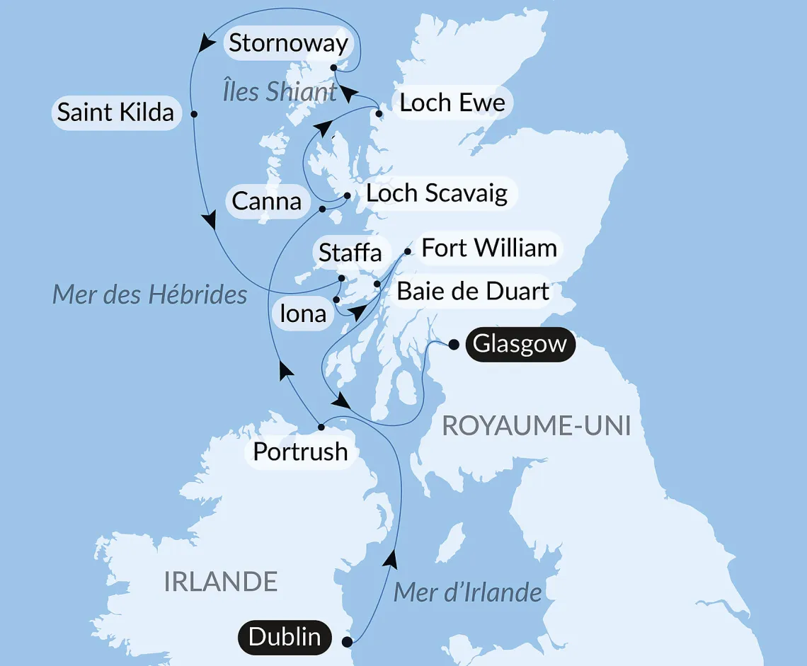 Маршрут круиза: Дублин - Портраш - Канна - Лок Хорн - остров Шиант - Залив Ю - Сторновей - Сент-Килда архипелаг - о. Айона - о. Стаффа - Форт-Уильям - Дюарт, о. Малл - Гринок / Глазго
