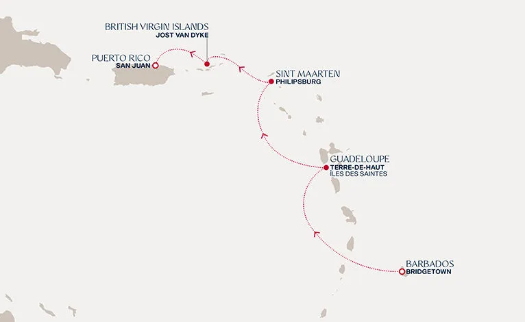 Маршрут круиза: Бриджтаун, о. Барбадос - о. Тер-де-О, Гваделупа - Филипсбург, о. Синт-Мартен - о. Йост-Ван-Дайк - Сан-Хуан