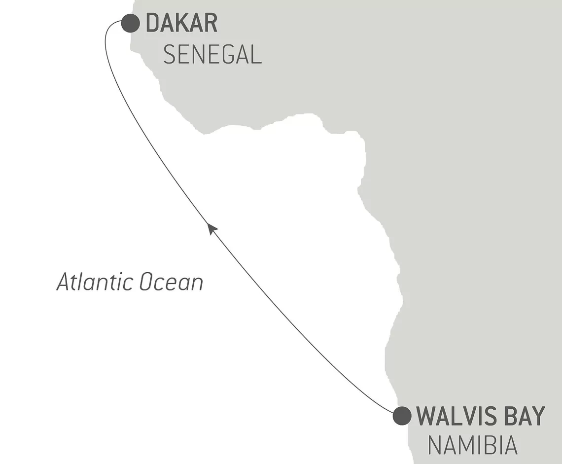 Маршрут круиза: Дакар - море - Прая - Минделу, о. Сан-Висенте - море - море - Санта-Крус-де-ла-Пальма, о. Ла-Пальма - Санта-Крус-де-Тенерифе, о. Тенерифе - Пуэрто де ла Эстака, о. Иерро - Аресифи, о. Лансароте - Лас-Пальмас, о. Гран-Канария