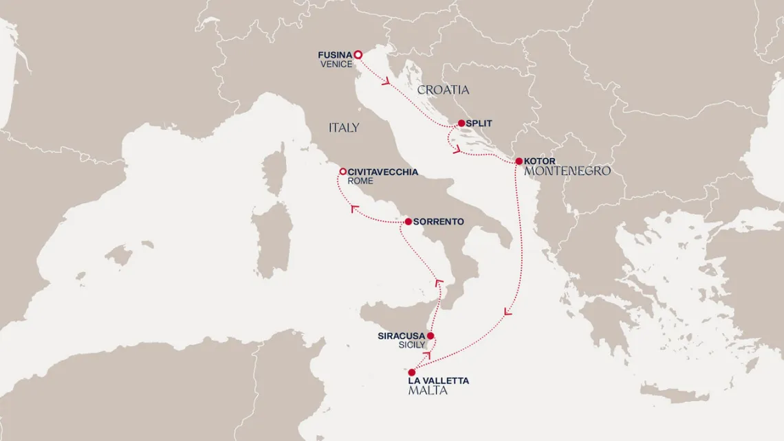 Маршрут круиза: Барселона - Марсель - Аяччо, о. Корсика - Ливорно / Флоренция, Пиза - Чивитавеккья / Рим - море - Валенсия - Пальма-де-Майорка - Барселона - море - Неаполь / Помпеи - море - Валлетта - Сиракузы, о. Сицилия - море - о. Корфу - Котор - Бриндизи - Сплит - Венеция