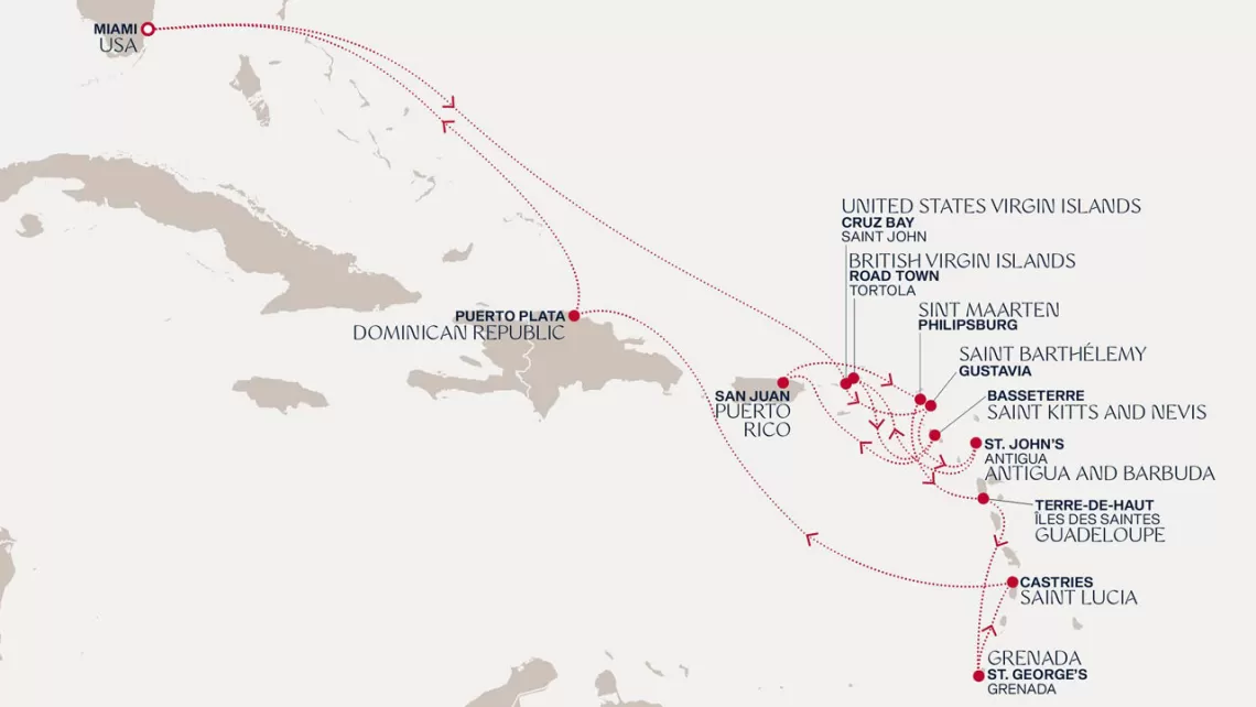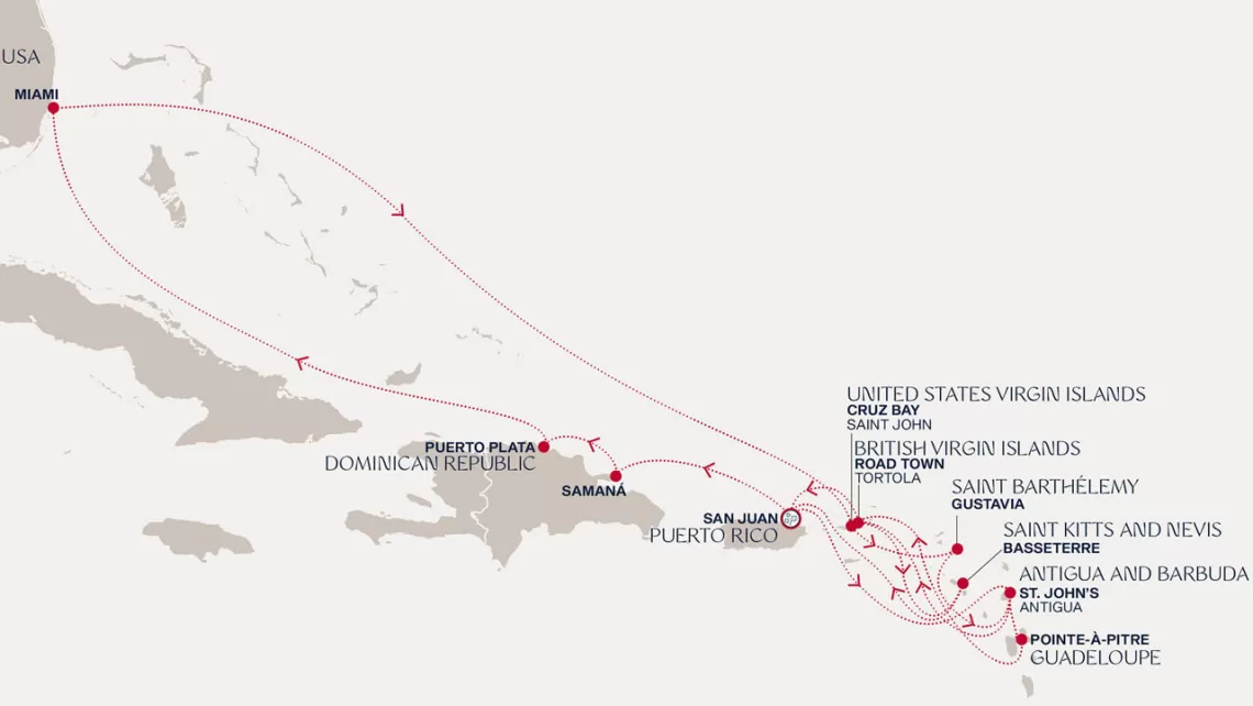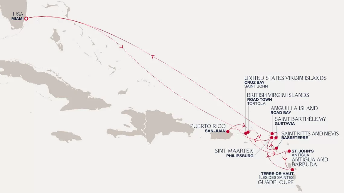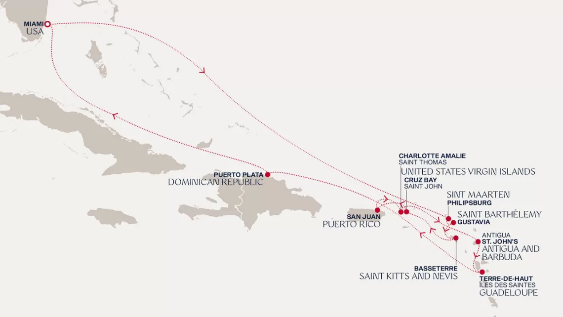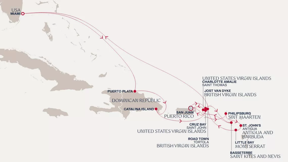 Маршрут круиза: Майами - море - море - о. Сент-Джон - Сент-Джонс, о.Антигуа - о. Тер-де-О, Гваделупа - Филипсбург, о. Синт-Мартен - Сан-Хуан - Род-Таун, о. Тортола - Бастер, о. Сент-Китс - Густавия, о. Сен-Бартельми - Густавия, о. Сен-Бартельми - Роуд Бэй, о. Ангилья - море - море - Майами