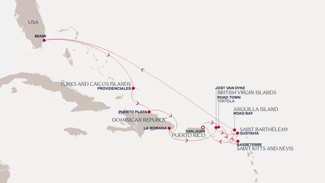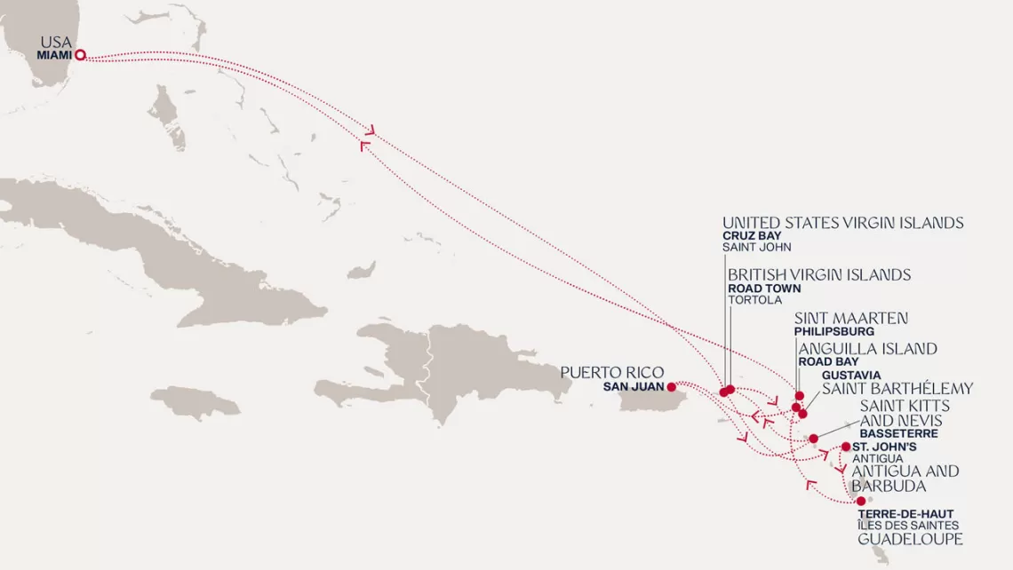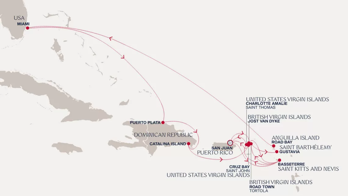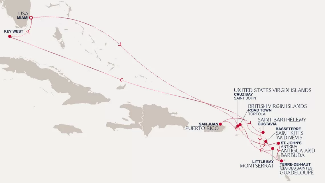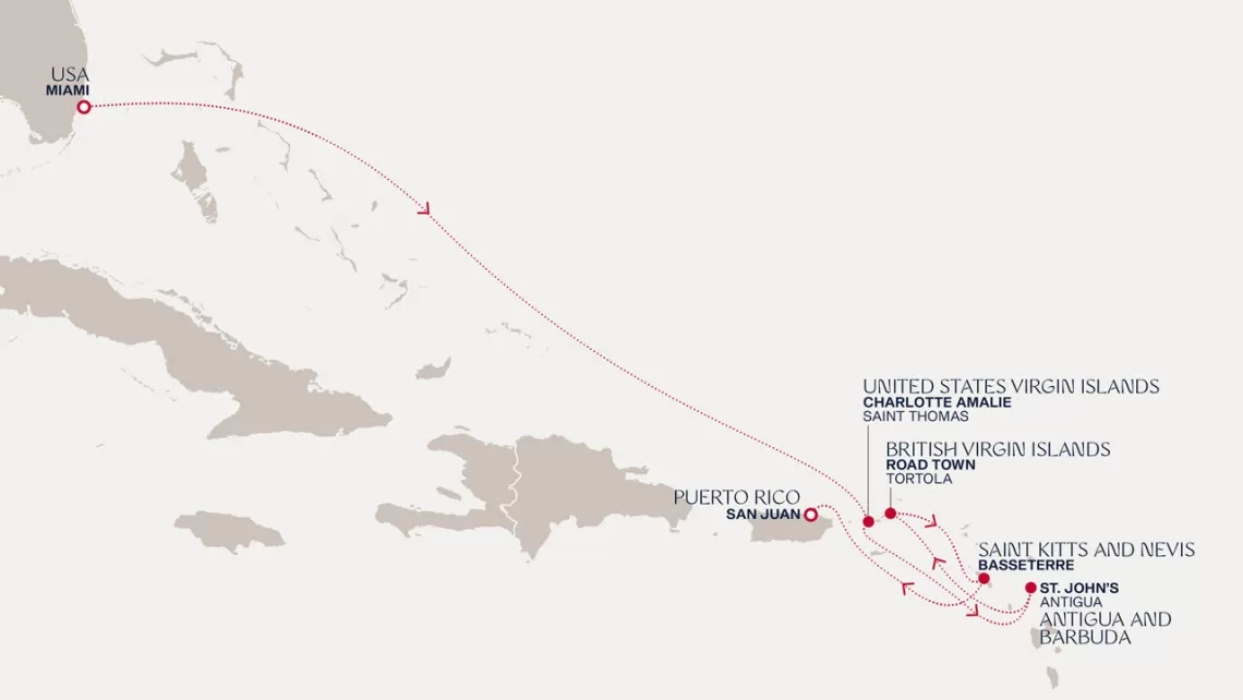 Маршрут круиза: Майами - море - море - о. Сент-Джон - Сент-Джонс, о.Антигуа - о. Тер-де-О, Гваделупа - Филипсбург, о. Синт-Мартен - Сан-Хуан - Род-Таун, о. Тортола - Бастер, о. Сент-Китс - Густавия, о. Сен-Бартельми - Густавия, о. Сен-Бартельми - Роуд Бэй, о. Ангилья - море - море - Майами