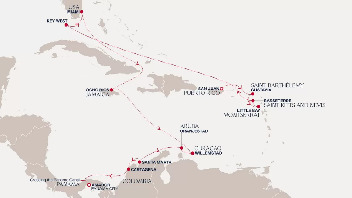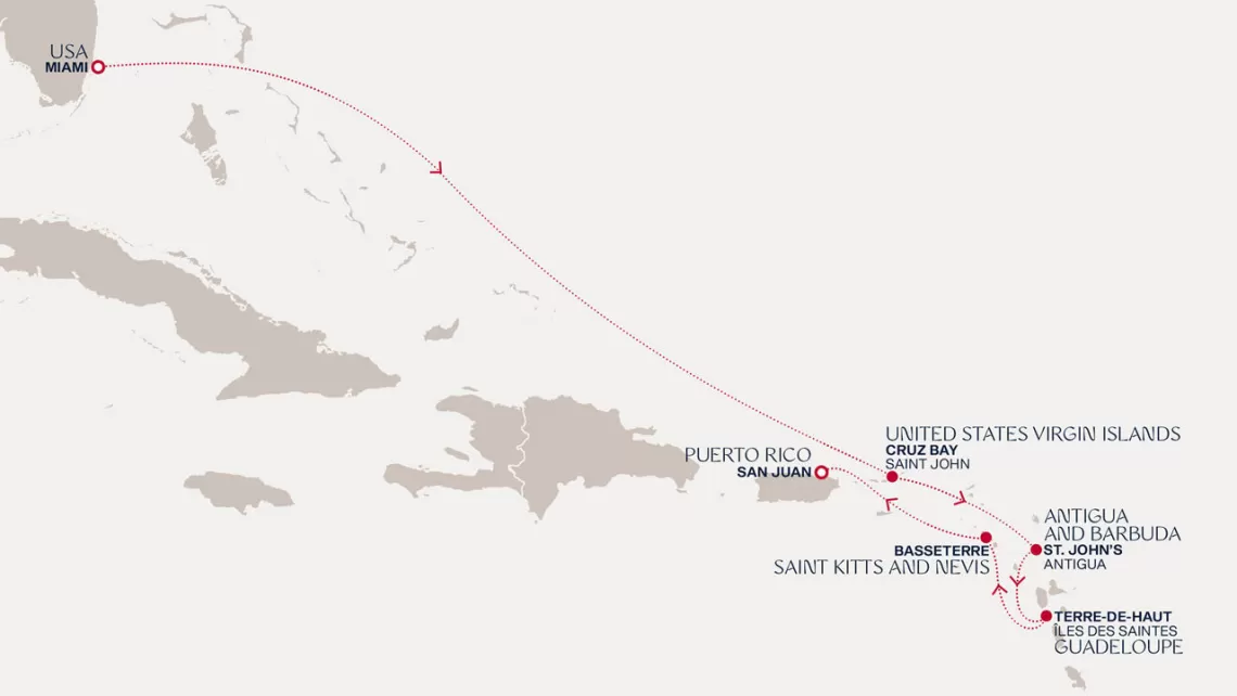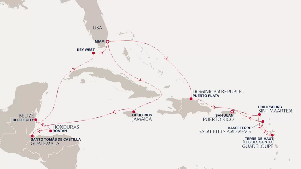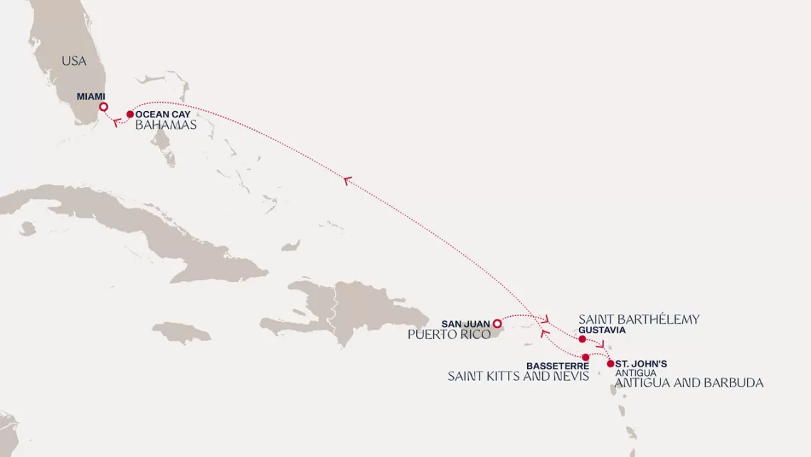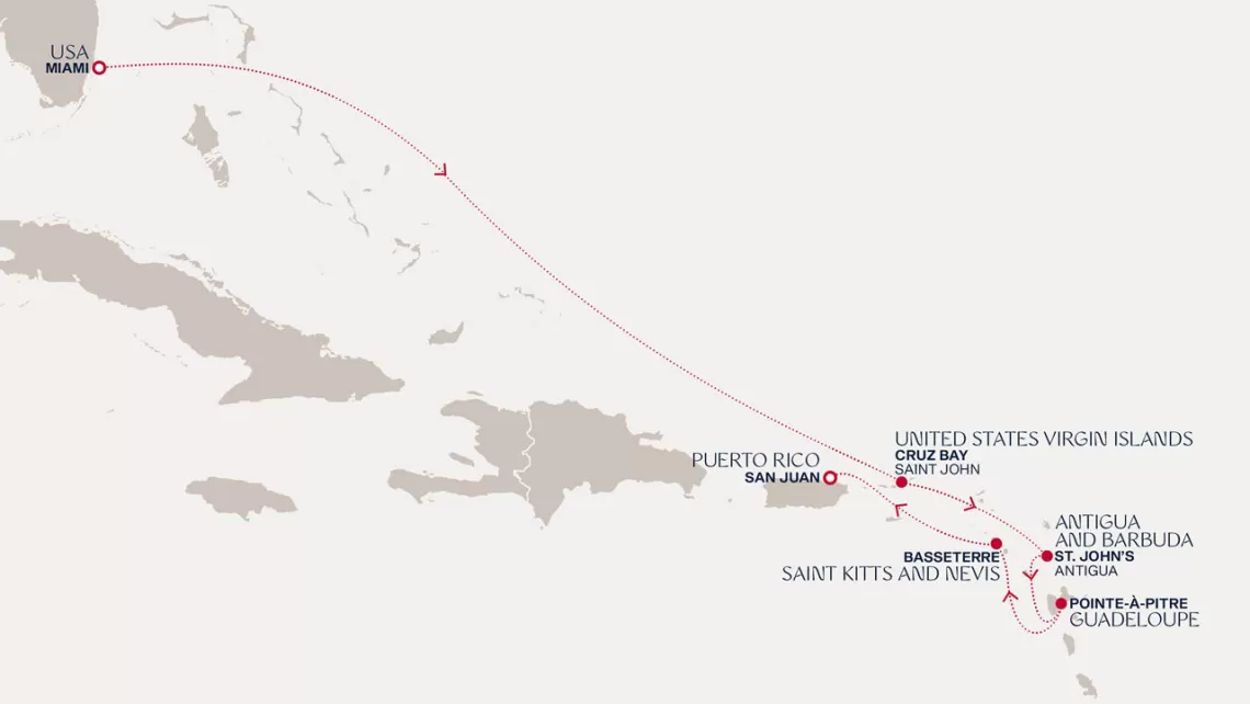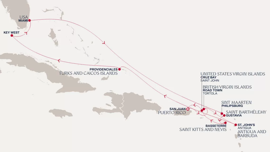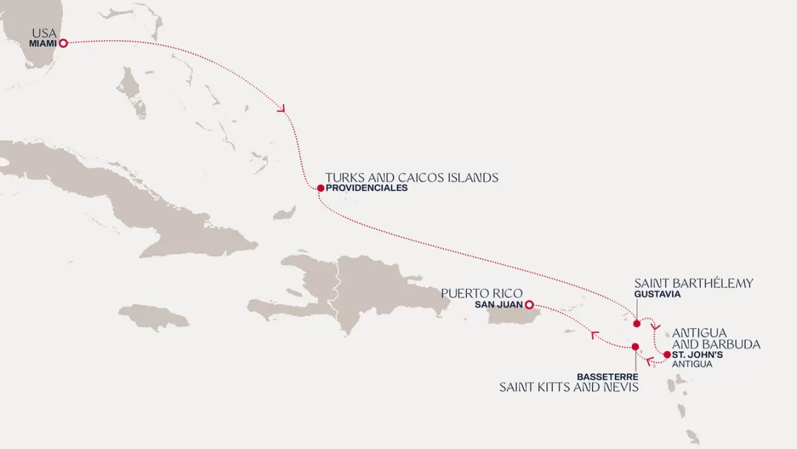 Маршрут круиза: Майами - море - море - о. Сент-Джон - Сент-Джонс, о.Антигуа - о. Тер-де-О, Гваделупа - Густавия, о. Сен-Бартельми - Сан-Хуан - Роуд Бэй, о. Ангилья - Сент-Джонс, о.Антигуа - Бастер, о. Сент-Китс - море - о. Гранд-Терк - море - Майами