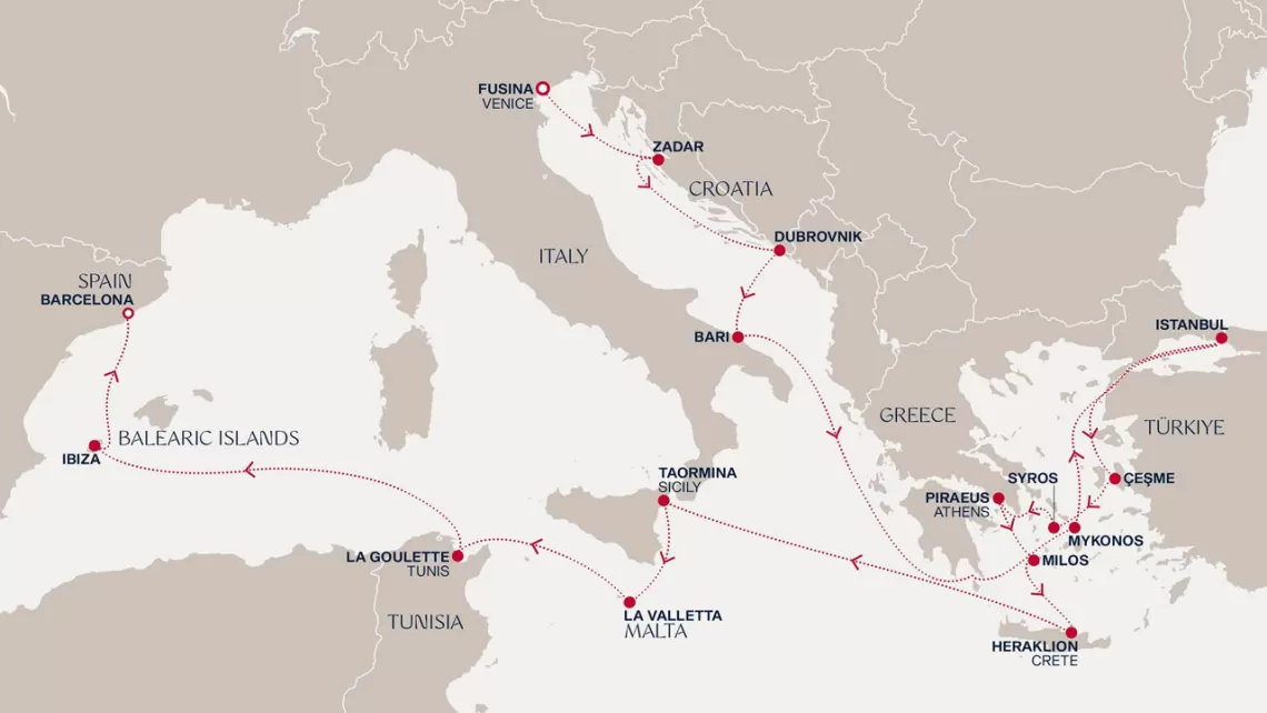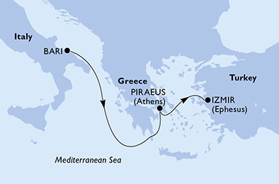 Маршрут круиза: Пирей / Афины - о. Кефалония - Дубровник - Дубровник - Котор - Бари - Керкира, о. Корфу - Катаколон / Олимпия - Пирей / Афины - Салоники - Кушадасы / Эфес - Ираклион, о.Крит - о. Санторини - о. Санторини - о. Миконос - о. Миконос - о. Милос - Пирей / Афины