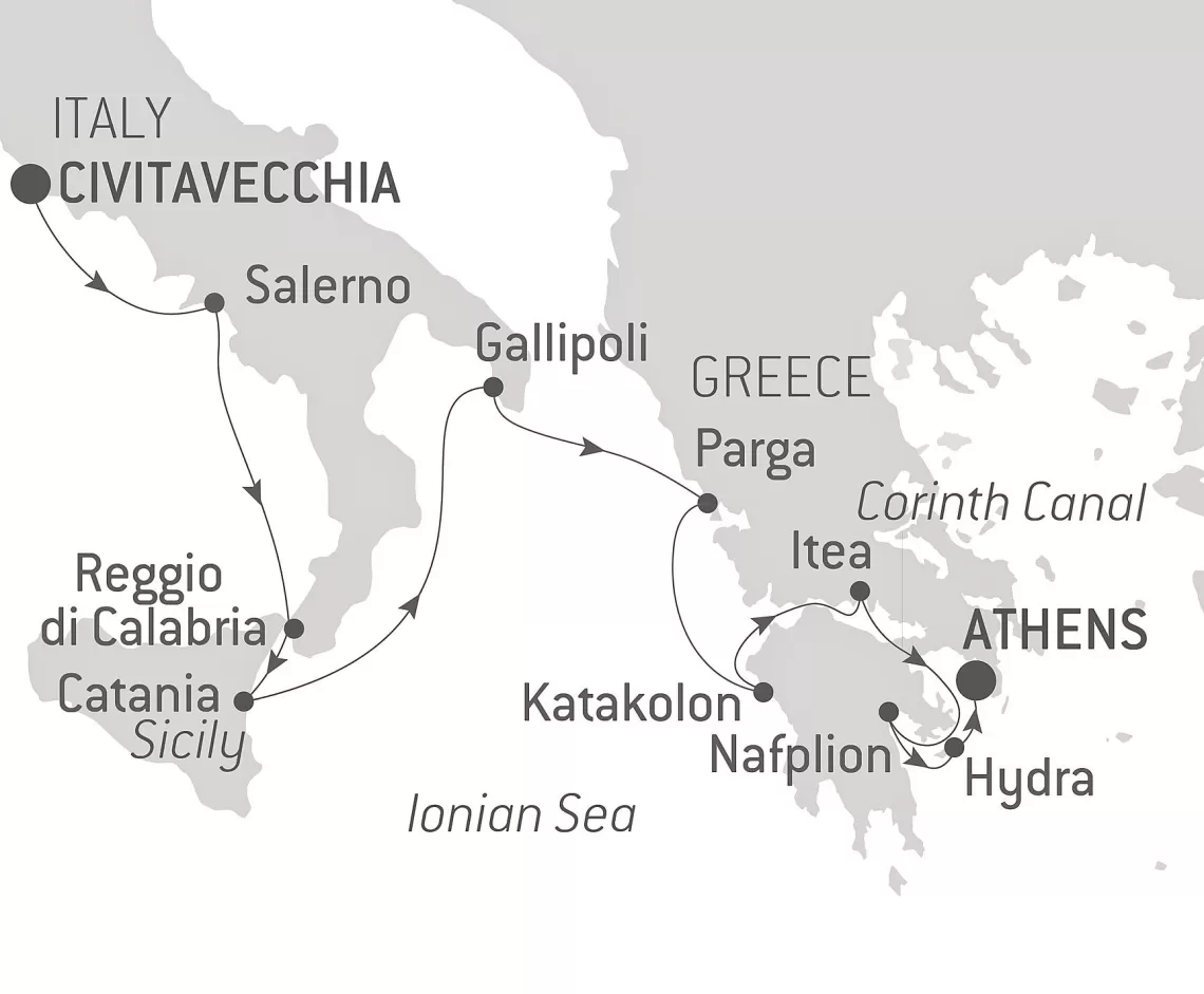 Маршрут круиза: Валлетта - Порт Эмпедокле, о. Сицилия - Трапани, о. Сицилия - Палермо, о. Сицилия - о. Липари - о. Стромболи - Салерно - Реджо-ди-Калабрия - Таормина, о. Сицилия - Сиракузы, о. Сицилия - Валлетта