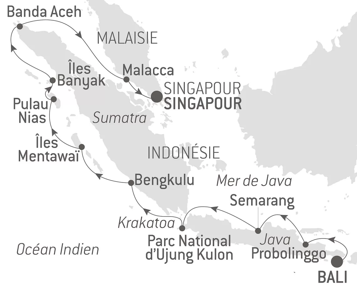 Маршрут круиза: Беноа, о. Бали - Проболинго, о. Ява - море - Семаранг, о. Ява - море - Уджунг-Кулон национальный парк - вулкан Кракатау - Бенкулу, о. Суматра - острова Ментавай - Пулау Ниас - Пулау Асок - Банда-Ачех - море - Малакка - Сингапур