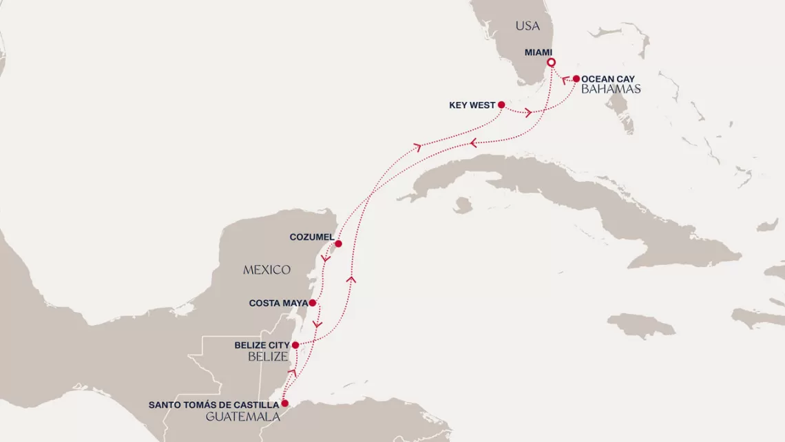 Маршрут круиза: Майами - море - Косумель - Белиз-Сити - Санто-Томас-де-Кастилья - море - Ки-Уэст - Майами - море - море - Шарлотта-Амалия, о. Сент-Томас - Пуант-а-Питр, о. Гваделупа - Сен-Пьер, о. Мартиника - Кастри, о. Сент-Люсия - Сент-Джорджес, о. Гренада - Кингстаун, о. Сент-Винсент - Бриджтаун, о. Барбадос