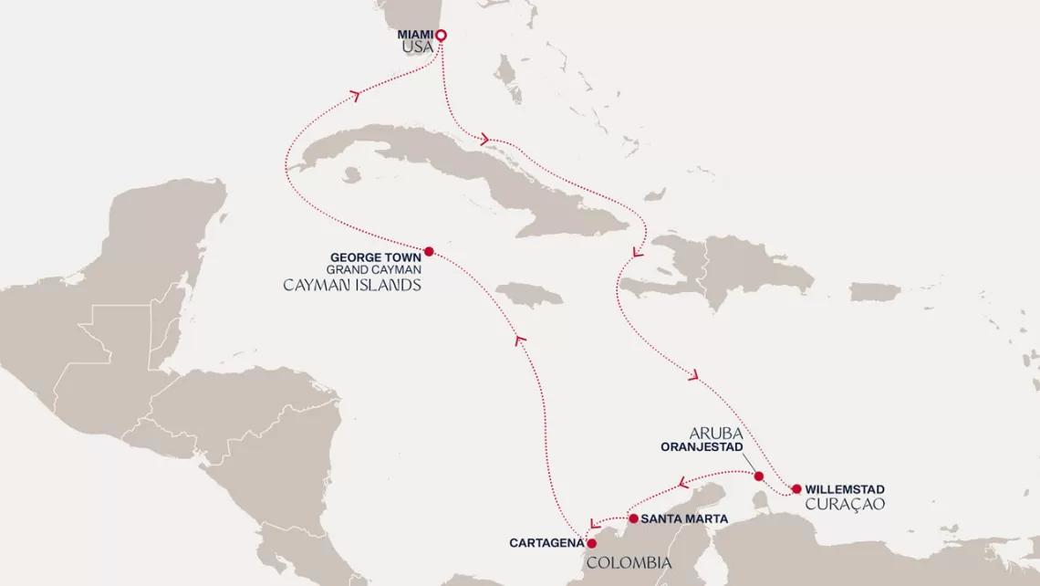 Маршрут круиза: Сан-Хуан - Густавия, о. Сен-Бартельми - Густавия, о. Сен-Бартельми - Литл-Бэй, о. Монтсеррат - Бастер, о. Сент-Китс - море - море - Ки-Уэст - Майами - море - Очо-Риос - море - Виллемстад - Ораньестад, о. Аруба - Санта-Марта - Картахена - Картахена - Панамский канал - Пуэрто Амадор - Пуэрто Амадор
