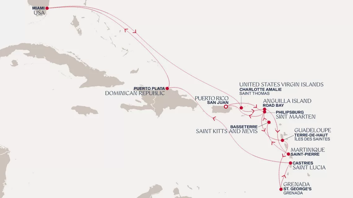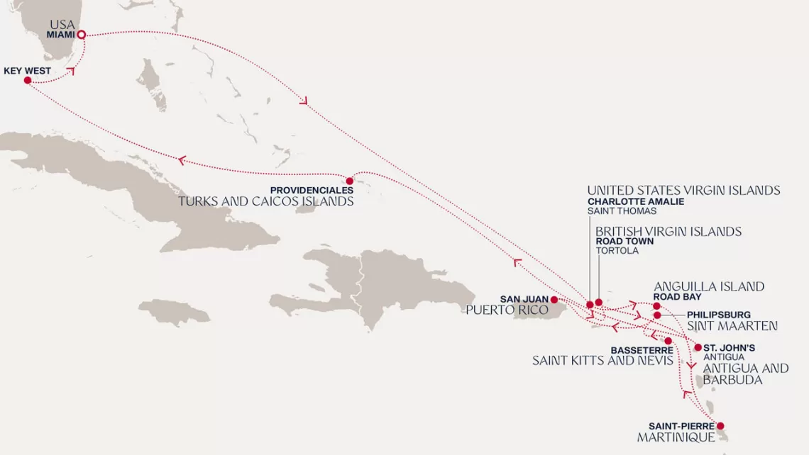 Маршрут круиза: Майами - море - море - Шарлотта-Амалия, о. Сент-Томас - Пуант-а-Питр, о. Гваделупа - Сен-Пьер, о. Мартиника - Кастри, о. Сент-Люсия - Сент-Джорджес, о. Гренада - Кингстаун, о. Сент-Винсент - Бриджтаун, о. Барбадос - о. Бекия - Порт-оф-Спейн, о. Тринидад - Фор-де-Франс, о. Мартиника - Литл-Бэй, о. Монтсеррат - Род-Таун, о. Тортола - море - море - Майами