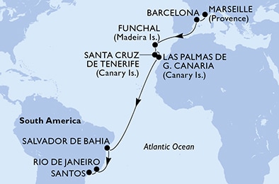 Маршрут круиза: Марсель - Барселона - море - море - Фуншал, о. Мадейра - Санта-Крус-де-Тенерифе, о. Тенерифе - Лас-Пальмас, о. Гран-Канария - море - море - море - море - море - море - Сальвадор - море - море - Рио-де-Жанейро - Сантус