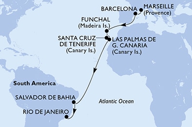 Маршрут круиза: Марсель - Барселона - море - море - Фуншал, о. Мадейра - Санта-Крус-де-Тенерифе, о. Тенерифе - Лас-Пальмас, о. Гран-Канария - море - море - море - море - море - море - Сальвадор - море - море - Рио-де-Жанейро