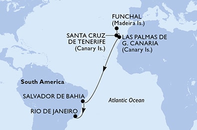 Маршрут круиза: Генуя / Милан - Марсель - Барселона - море - море - Лас-Пальмас, о. Гран-Канария - море - море - море - море - море - море - Сальвадор - Ильеус - море - о. Илья-Гранди - Рио-де-Жанейро