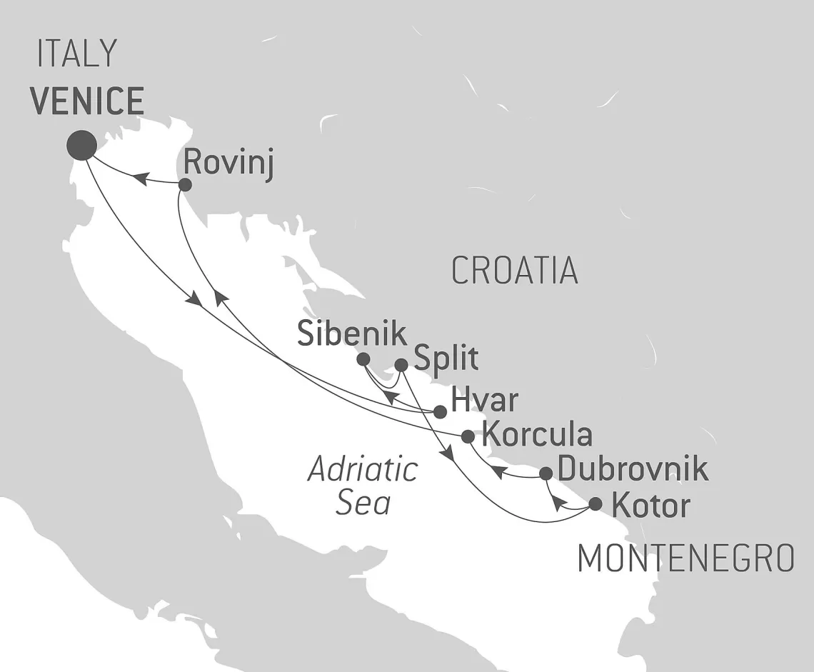 Маршрут круиза: Пирей / Афины - Кушадасы / Эфес - о. Родос - Агиос Николаос, о. Крит - о. Санторини - о. Миконос - о. Миконос - о. Милос - Пирей / Афины - о. Кефалония - Дубровник - Дубровник - Котор - Бари - Керкира, о. Корфу - Катаколон / Олимпия - Пирей / Афины