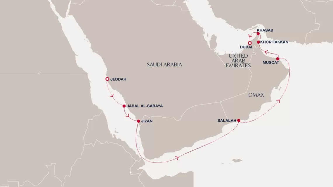 Маршрут круиза: Джидда - Джебель Аль-Сабайя - Джизан - море - море - море - Салала - море - Маскат - Хор-Факкан - Хасаб - Дубай