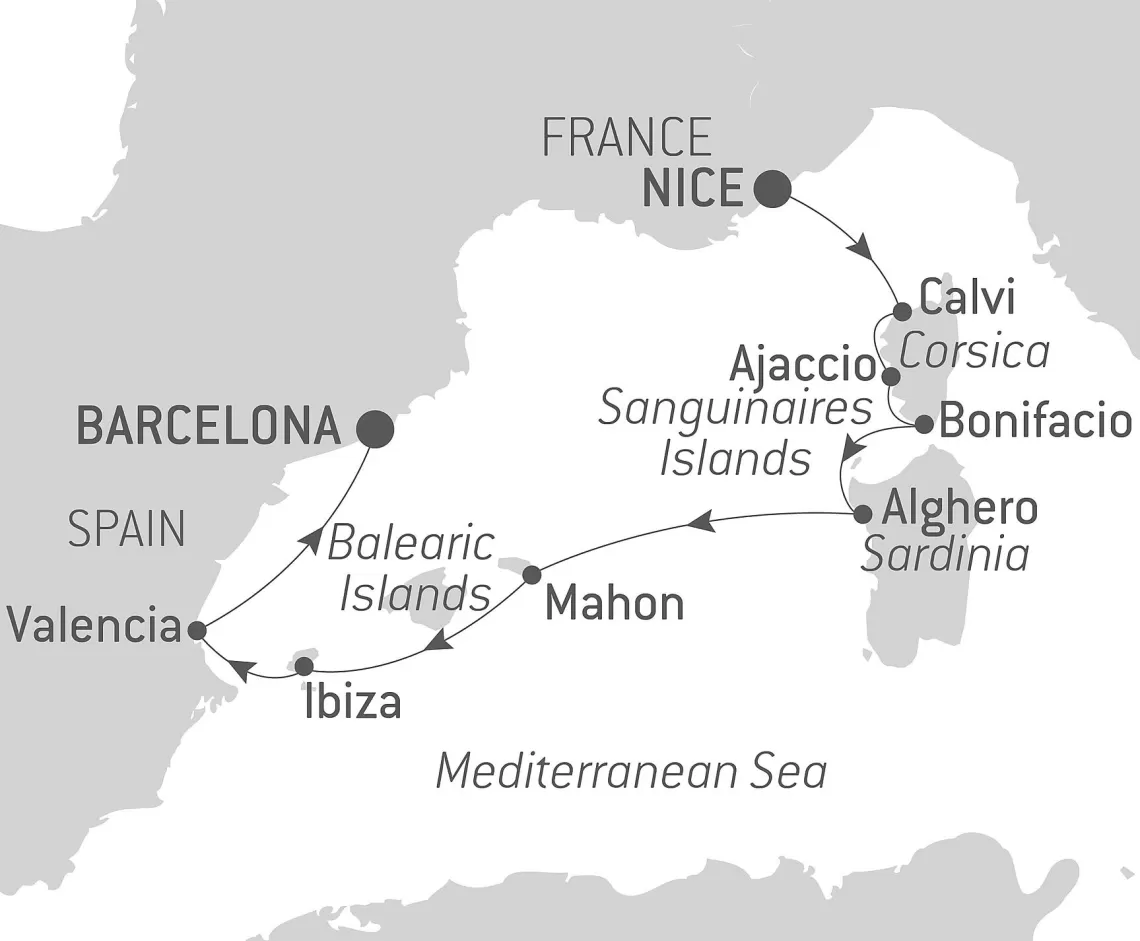 Маршрут круиза: Ницца - Кальви, о. Корсика - Аяччо, о. Корсика - Архипелаг Сангинэр - Бонифачо, о. Корсика - Альгеро, о. Сардиния - Маон, о. Менорка - о. Ибица - Валенсия - Барселона