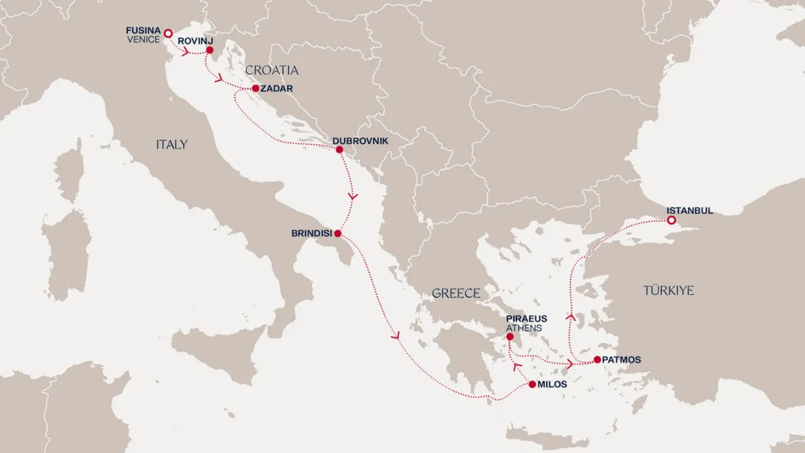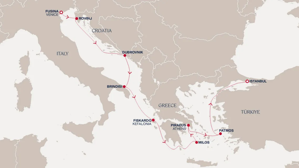 Маршрут круиза: Венеция - Ровинь - Дубровник - Бриндизи - Фискардо, о. Кефалония - море - о. Милос - Пирей / Афины - о. Патмос - море - Стамбул - Стамбул - Кушадасы / Эфес - о. Миконос - Пирей / Афины