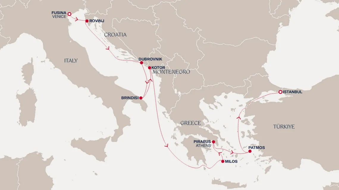 Маршрут круиза: Венеция - Ровинь - Дубровник - Бриндизи - Котор - море - о. Милос - Пирей / Афины - о. Патмос - море - Стамбул - Стамбул - Кушадасы / Эфес - о. Миконос - Пирей / Афины