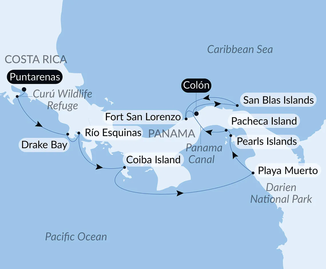 Маршрут круиза: Сан-Хуан - Густавия, о. Сен-Бартельми - Густавия, о. Сен-Бартельми - Литл-Бэй, о. Монтсеррат - Бастер, о. Сент-Китс - море - море - Ки-Уэст - Майами - море - Очо-Риос - море - Виллемстад - Ораньестад, о. Аруба - Санта-Марта - Картахена - Картахена - Панамский канал - Пуэрто Амадор - Пуэрто Амадор