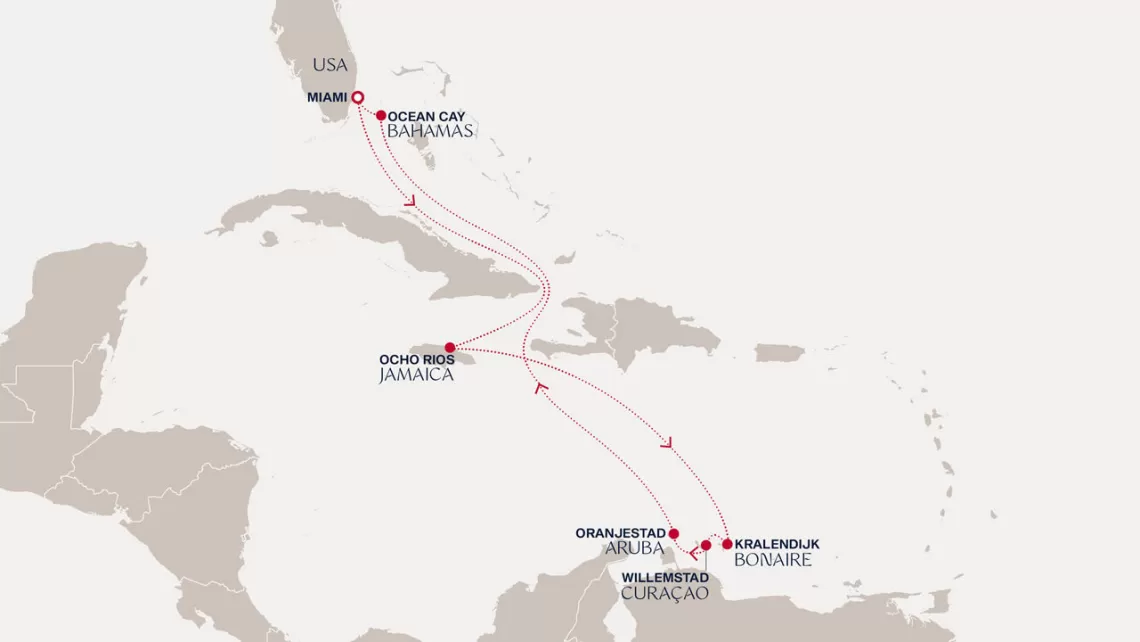 Маршрут круиза: Майами - море - Джорджтаун, о. Большой Кайман - Очо-Риос - море - Виллемстад, о. Кюрасао - Кралендейк, о. Бонэйр - Ораньестад, о. Аруба - море - море - Майами