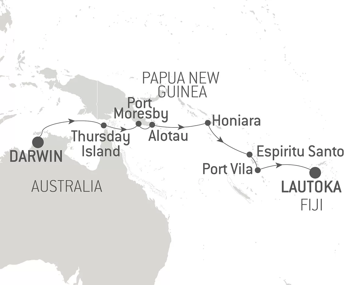 Маршрут круиза: Дарвин - море - море - о. Терсди-Айленд - море - Алотау - о. Самарай - море - Хониара - Хониара - море - море - о. Эспириту-Санто - Порт-Вила - море - море - море - Лаутока, о. Вити-Леву