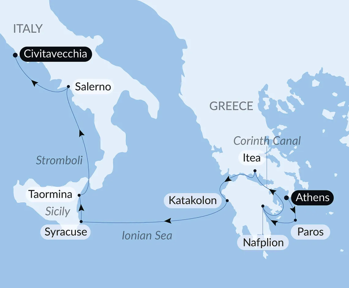 Маршрут круиза: Пирей / Афины - о. Парос - Нафплион - Коринфский канал - Итея - Катаколон / Олимпия - Сиракузы, о. Сицилия - о. Стромболи - Таормина, о. Сицилия - Салерно - Чивитавеккья / Рим