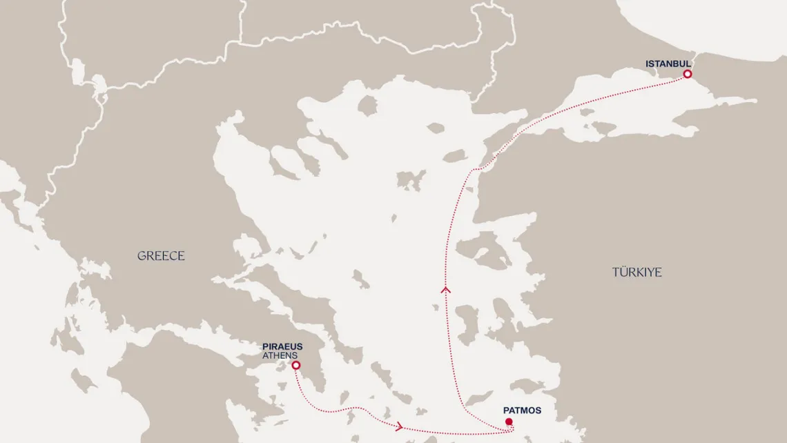 Маршрут круиза: Пирей / Афины - о. Патмос - о. Делос - о. Парос - о. Милос - Нафплион - о. Идра - Коринфский канал - Галаксиди / Дельфы - море - Таормина, о. Сицилия - Гаэта - Порто Санто Стефано - Кальви, о. Корсика - Ницца