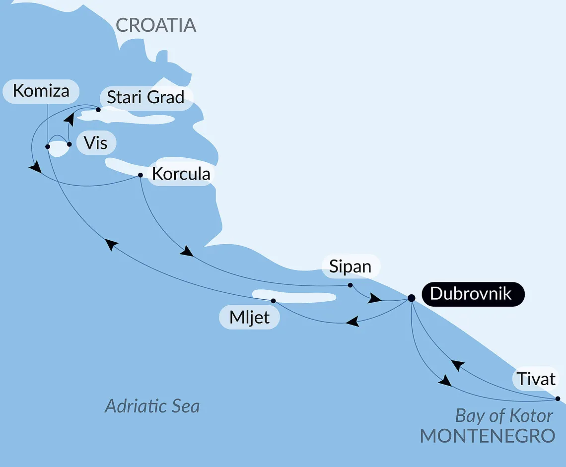 Маршрут круиза: Дубровник - о. Млет - о. Вис - о. Вис - Хвар - Корчула - Дубровник - о. Шипан - Бококоторская бухта - Тиват - Дубровник