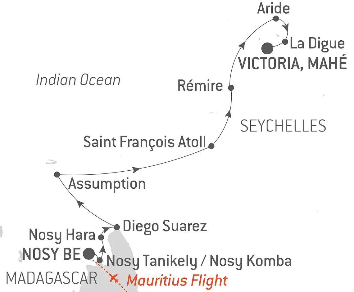 Маршрут круиза: Виктория, о. Маэ - о. Ла-Диг - о. Арид - о. Кюрьёз - остров Ремир - остров Сен-Франсуа - о. Фаркуар - Анциранана - Анциранана - о. Нуси-Хара - о. Нуси-Комба - о. Нуси-Таникели - о. Нуси-Бе