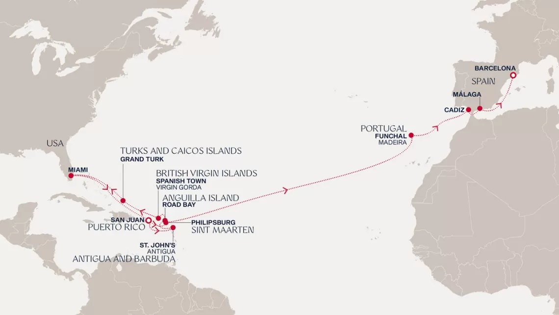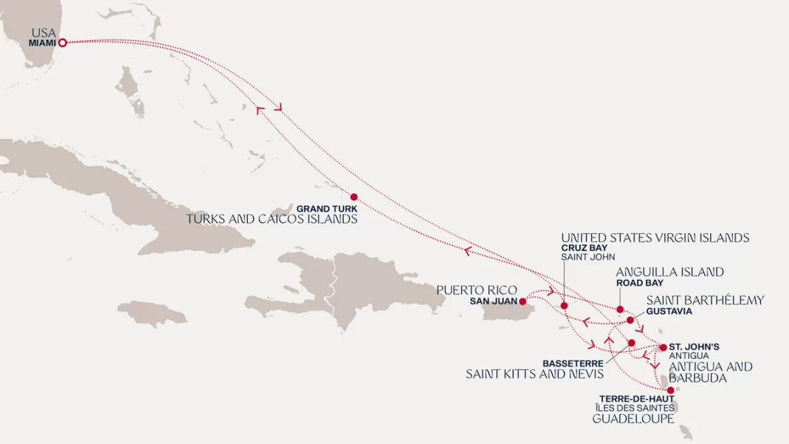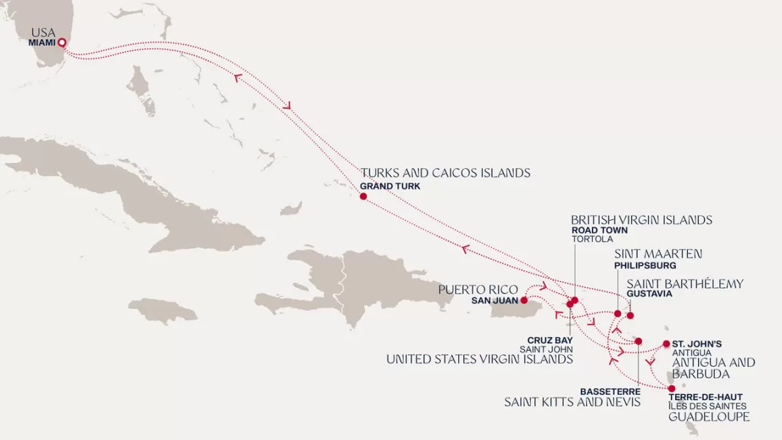 Маршрут круиза: Майами - море - море - о. Сент-Джон - Сент-Джонс, о.Антигуа - о. Тер-де-О, Гваделупа - Шарлотта-Амалия, о. Сент-Томас - Сан-Хуан - Филипсбург, о. Синт-Мартен - Густавия, о. Сен-Бартельми - Густавия, о. Сен-Бартельми - Бастер, о. Сент-Китс - море - о. Гранд-Терк - море - Майами
