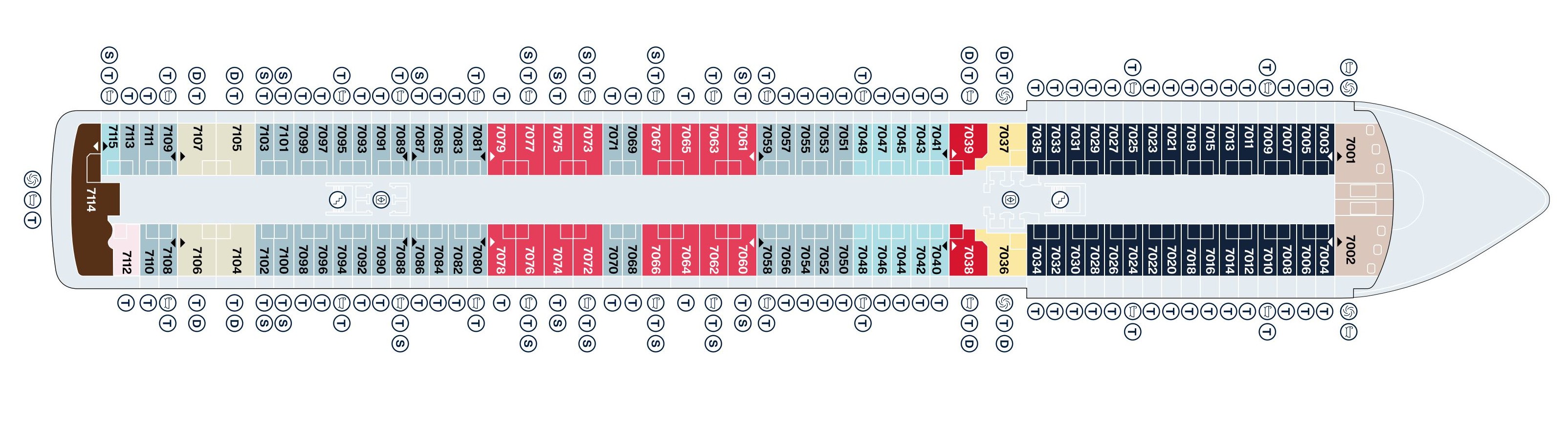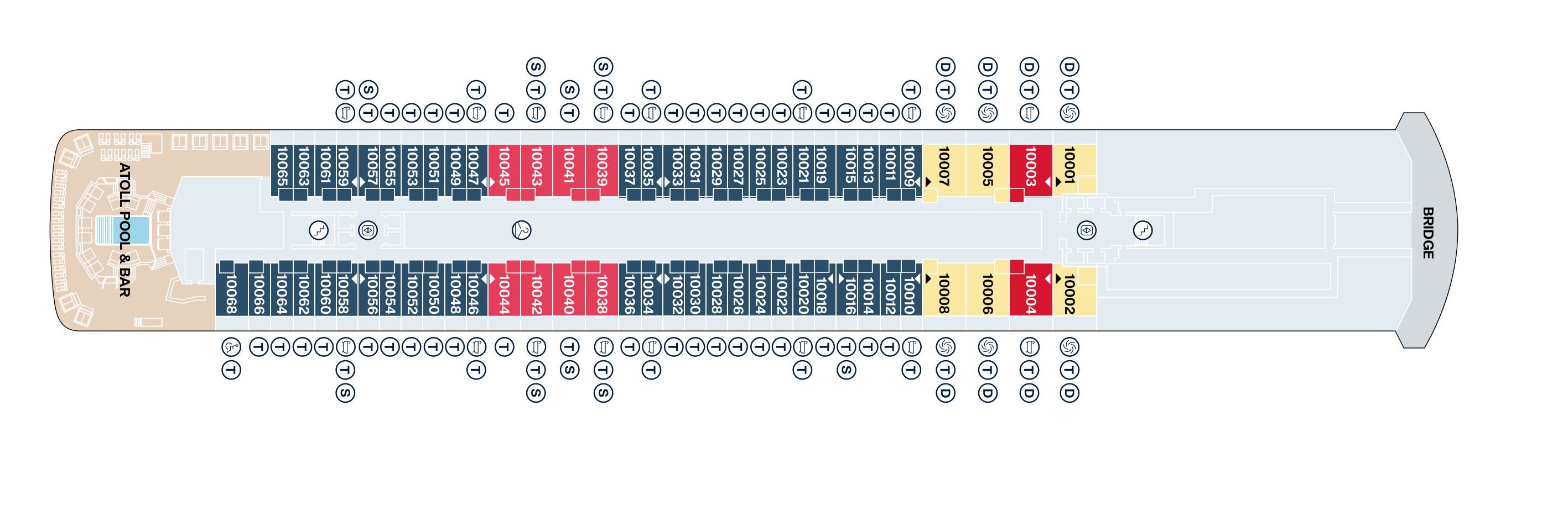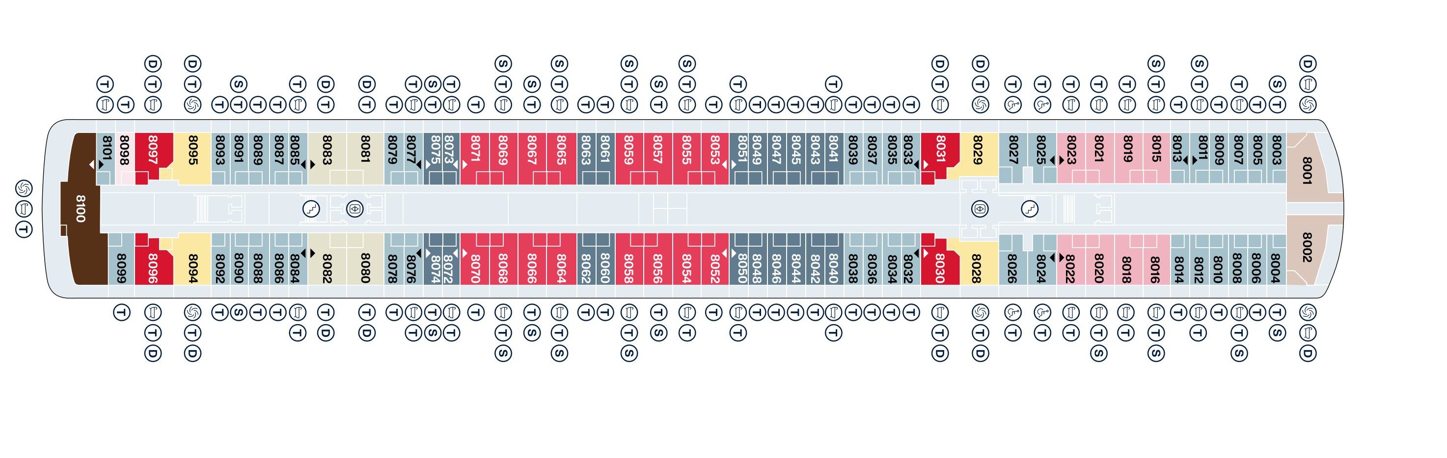 Расположение каюты можно посмотреть на плане палуб во вкладке "Круизный лайнер" на странице выше. Первые цифры номера каюты - номер палубы. Каюты отмеченные "для инвалидов" могут быть заменены MSC на каюту той же категории с другим расположением на лайнере без согласования с Клиентом.