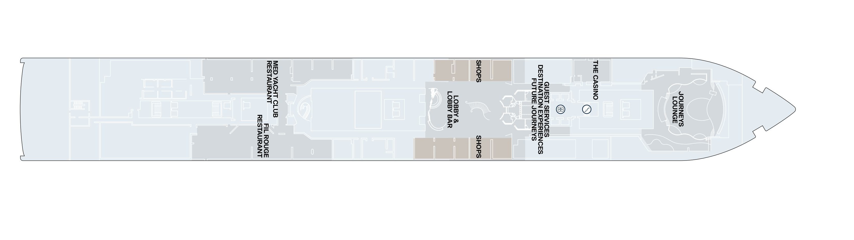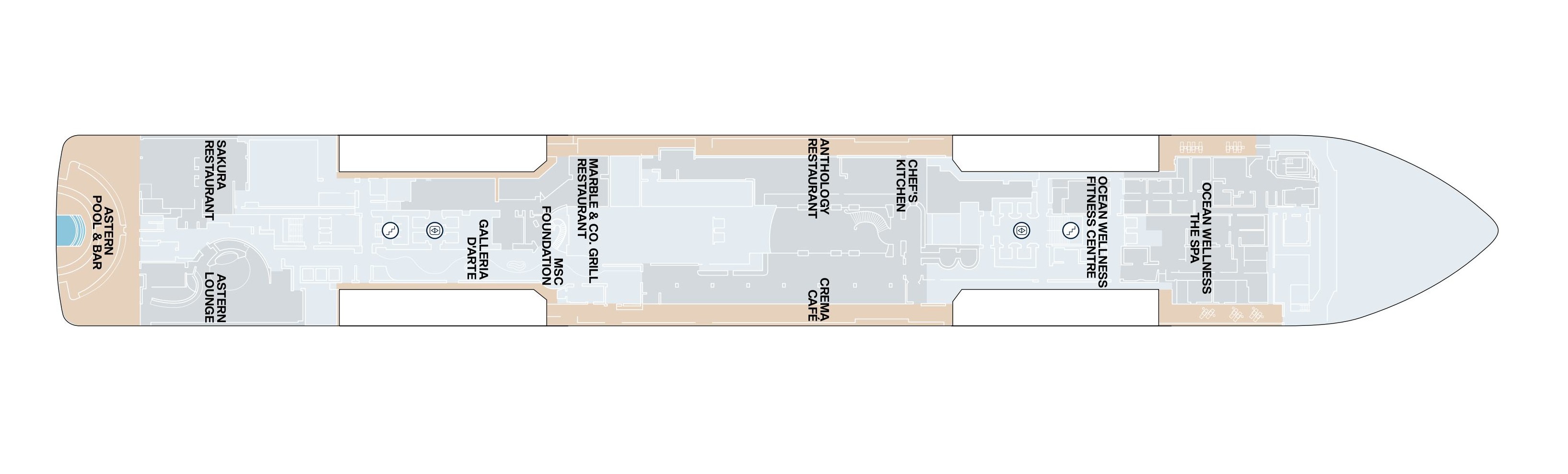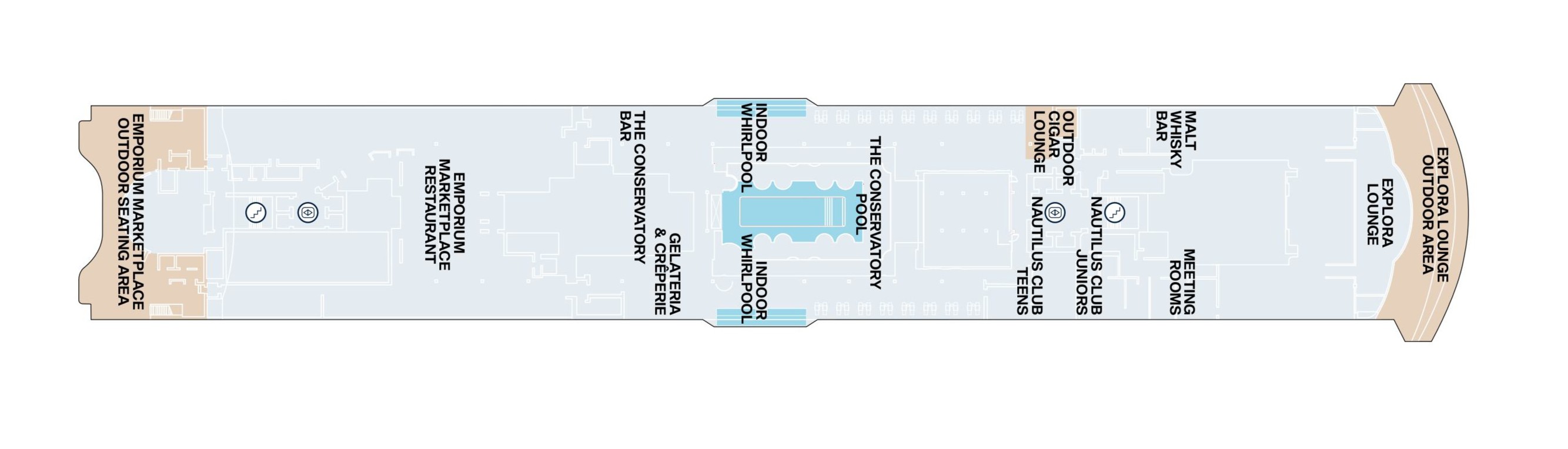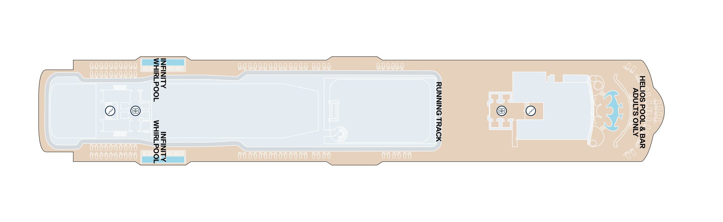 • просторная панорамная терраса во всю ширину лайнера, обеденная и лаундж-зоны, джакузи и шезлонги, душ.