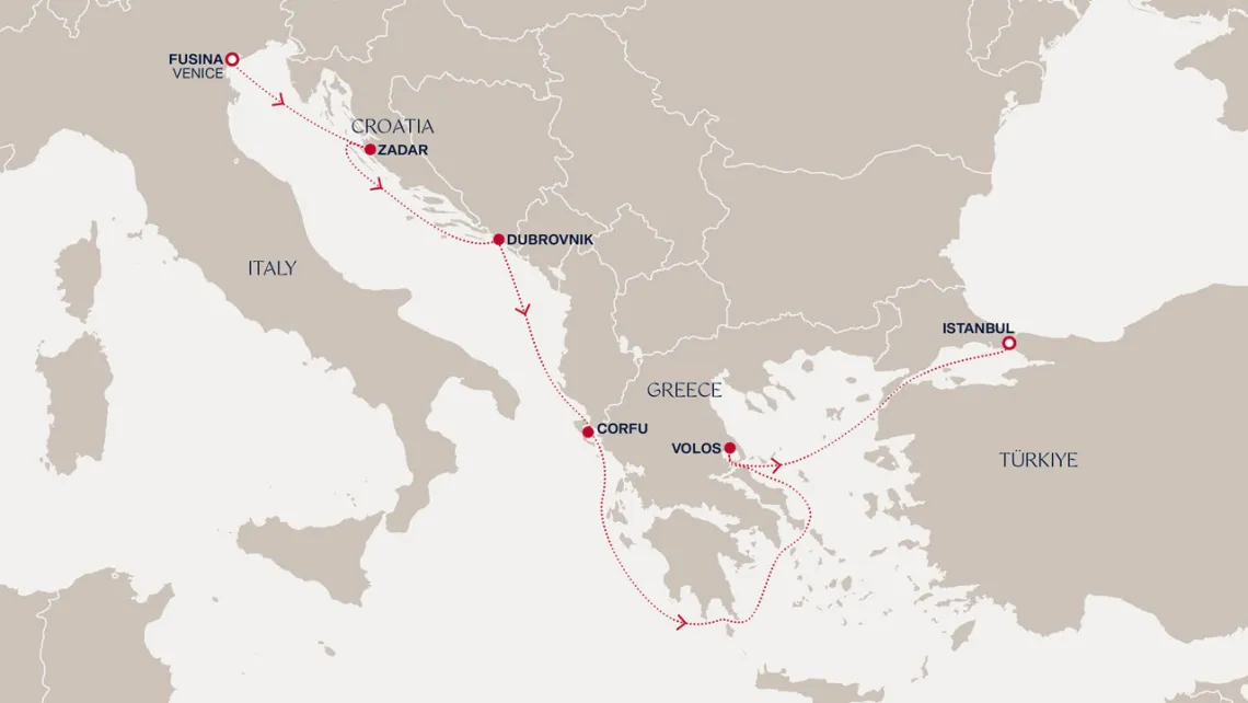 Маршрут круиза: Пирей / Афины - о. Сирос - Бодрум - о. Родос - Ираклион, о.Крит - море - Котор - Галлиполи - Хвар - Риека - Венеция