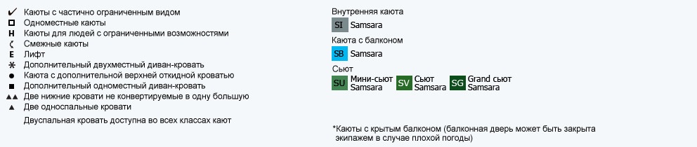 Большие панорамные окна со стеклянными дверями, которые ведут на просторный частный балкон, две односпальные кровати, большинство из которых можно преобразовать в двуспальную кровать, гардероб, ванная с джакузи и душем, отдельной гостиной зоной, мягкой мебелью, диваном-кроватью и туалетным столиком. Каждая каюта также имеет свой собственный интерактивный телевизор со спутниковой антенной, индивидуальный кондиционер, телефон, фен, мини-бар, индивидуальный сейф.