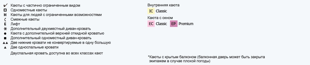 Вас порадует большая каюта с частным балконом площадью 3,5 кв.м, отделенный от жилого помещения стеклянными дверьми, панорамные окна; спальная зона с двумя односпальными кроватями с возможностью их объединения в одну кровать размера queen-size.